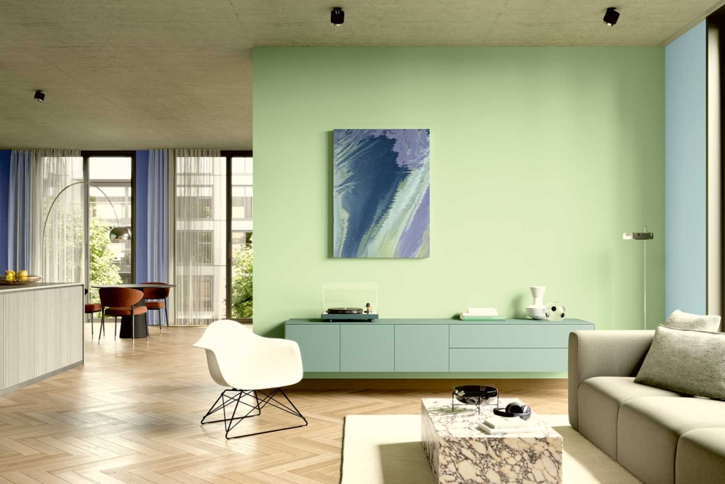 Wohnraum mit glatt ausgeführter Mintgrün-Akzentwand, hellblauen Wandflächen und hellem Fischgrätparkett – hochwertige Innenraumgestaltung vom Malerfachbetrieb Binder